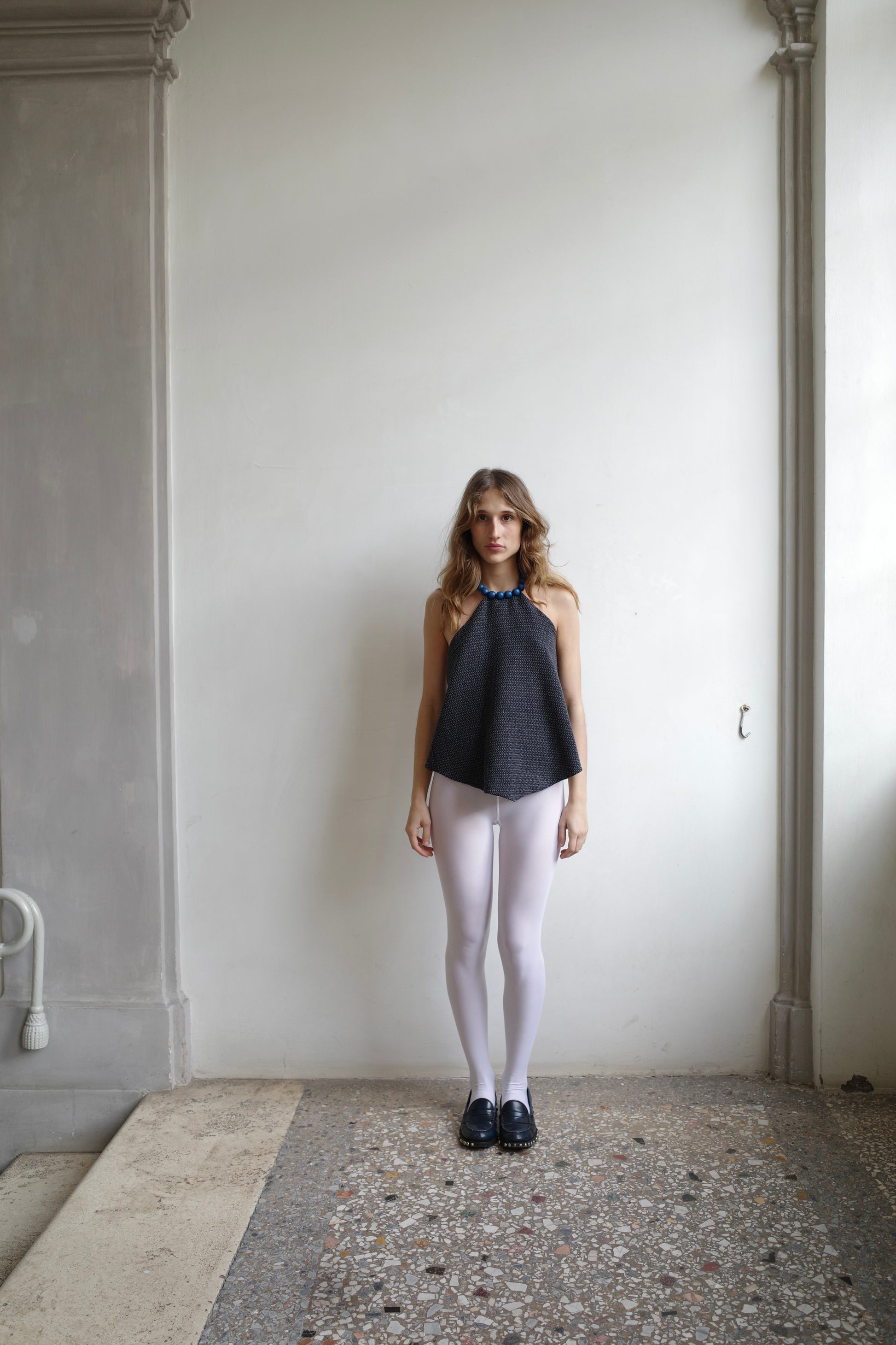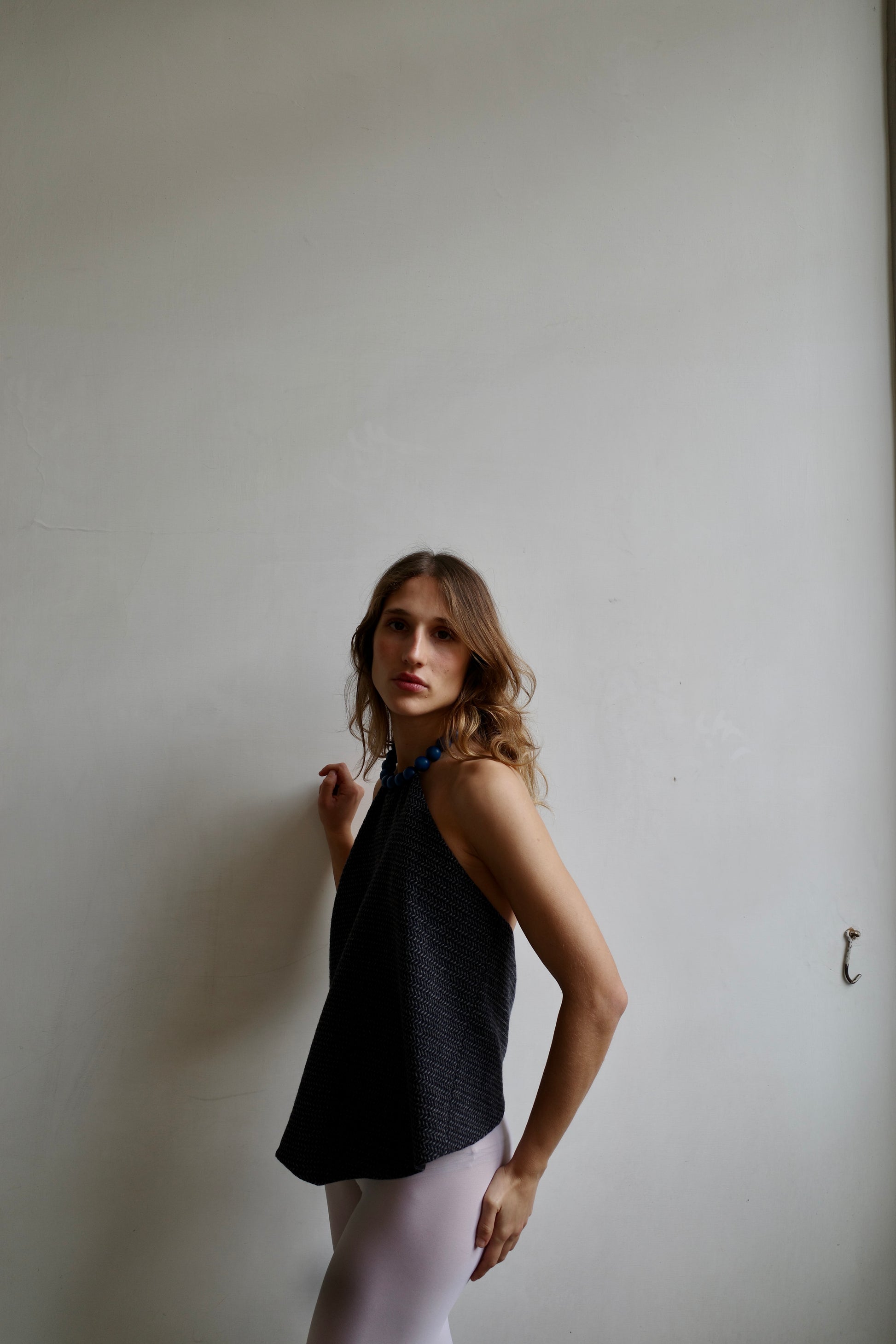 THESE ONE-OF-A-KIND TOPS ARE BOLD, WEARABLE STATEMENTS. DESIGNED FOR BOTH EVERYDAY WEAR AND SPECIAL OCCASIONS. KNOWN FOR DISREGARDING TRENDS AND FOCUSING INSTEAD ON TIMELESS APPEAL. WE WANTED TO CREATE A TOP THAT CELEBRATE INDIVIDUALITY, VERSATILITY, AND MODERN CRAFTSMANSHIP WITH A DOWNTOWN EDGE. THIS TOP IS MADE FROM WOOL AND A WOODEN BEADED HANDMADE BLUE NECKLACE.